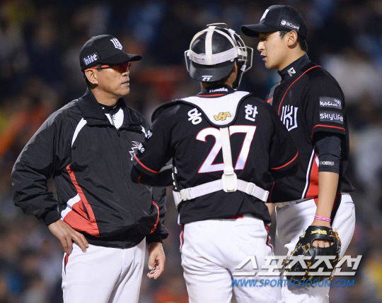 7일 대전 한화생명 이글스파크에서 KBO리그 한화와 kt의 경기가 열렸다. kt 조범현 감독이 7회 직접 마운드에 올라 투수를 교체했다. 바뀐 투수 최대성과 대화를 나누고 있는 조 감독. 대전=송정헌 기자 songs@sportschosun.com/2015.05.07