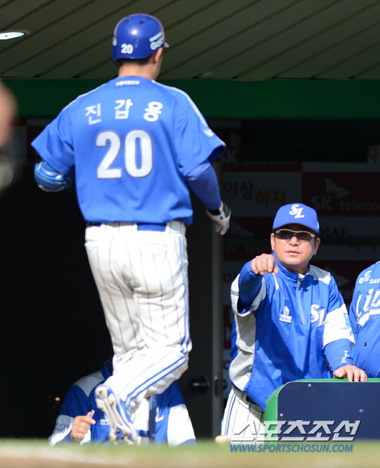 SK와 삼성의 2015 KBO 리그 주말 3연전 마지막 경기가 10일 인천 SK행복드림구장에서 열렸다. 6회초 2사 1,2루 삼성 진갑용이 SK 채병용의 투구를 받아쳐 좌측담장을 넘어가는 3점홈런을 날렸다. 홈인하며 류중일 감독과 하이파이브를 하는 진갑용. 인천=허상욱 기자 wook@sportschosun.com