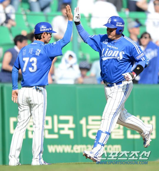 SK와 삼성의 2015 KBO 리그 주말 3연전 마지막 경기가 10일 인천 SK행복드림구장에서 열렸다. 6회초 2사 1,2루 삼성 진갑용이 SK 채병용의 투구를 받아쳐 좌측담장을 넘어가는 3점홈런을 날렸다. 홈인하며 김재걸 3루코치와 하이파이브를 하는 진갑용. 인천=허상욱 기자 wook@sportschosun.com/2015.05.10/
