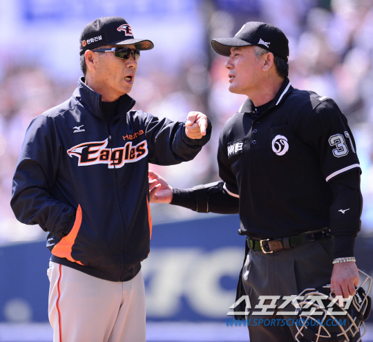 10일 오후 서울 잠실야구장에서 2015 프로야구 한화와 두산의 경기가 열렸다. 3회말 무사 1루서 두산 민병헌 타석 때 한화 탈보트가 보크 판정에 글러브를 던지며 항의, 퇴장 당한 후 김성근 감독이 김병주 주심에게 항의하고 있다. 잠실=김경민 기자 kyungmin@sportschosun.com / 2015.05.10. |