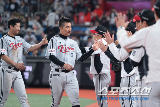 10일 수원 케이티위즈파크에서 KBO리그 kt 위즈와 LG 트윈스의 경기가 열렸다. kt에 2연패를 당했던 LG가 6대2로 승리를 거뒀다. 경기 종료 후 하이파이브를 나누고 있는 LG 선수들. 수원=송정헌 기자 songs@sportschosun.com/2015.05.10