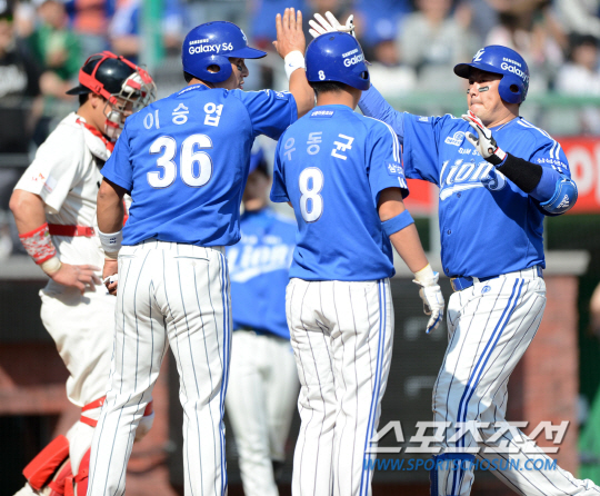 SK와 삼성의 2015 KBO 리그 주말 3연전 마지막 경기가 10일 인천 SK행복드림구장에서 열렸다. 6회초 2사 1,2루 삼성 진갑용이 SK 채병용의 투구를 받아쳐 좌측담장을 넘어가는 3점홈런을 날렸다. 홈인하며 선행주자 이승엽 우동균과 하이파이브를 하는 진갑용. 인천=허상욱 기자 wook@sportschosun.com/2015.05.10/ |