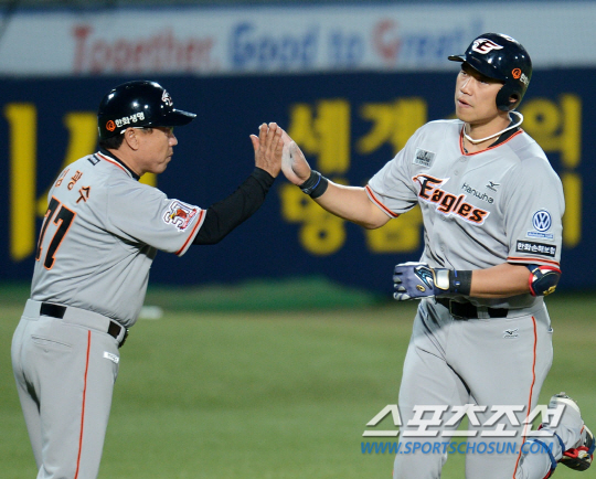 한화 이글스와 삼성 라이온즈의 2015 프로야구 경기가 12일 대구구장에서 열렸다. 4회초 무사 한화 최진행이 중월 솔로홈런을 치고 3루를 돌며 김광수 코치의 축하를 받고 있다. 대구=정재근 기자 cjg@sportschosun.com/2015.05.12/