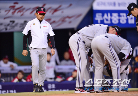 6일 오후 서울 잠실야구장에서 2015 프로야구 LG와 두산의 경기가 열렸다. 2회초 1사 1,3루서 LG 양상문 감독이 니퍼트에 손등을 맞은 손주인의 상태를 확인하러 그라운드에 나서고 있다. 잠실=김경민 기자 kyungmin@sportschosun.com / 2015.05.06.