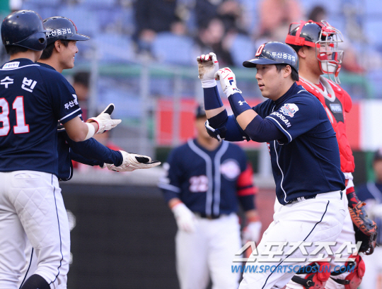 13일 인천 SK행복드림구장에서 KBO리그 SK와 두산의 경기가 열렸다. SK 윤희상과 두산 니퍼트가 선발 맞대결을 펼쳤다. 두산 김현수가 1회 무사 1,2루에서 SK 윤희상을 상대로 3점홈런을 날렸다. 홈에서 동료들과 하이파이브를 나누고 있는 김현수. 인천=송정헌 기자 songs@sportschosun.com