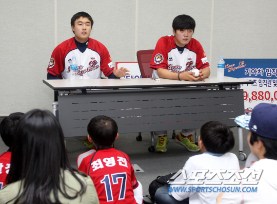 KIA 타이거즈 투수 한승혁과 심동섭(왼쪽부터)이 13일 기아 챔피언스필드에서 열린 kt 위즈전에 앞서 타이거즈 러브투게더 데이 행사의 일환으로 초청한 어린이들과 만나의 시간을 갖고 있다. 사진제공=KIA 타이거즈.