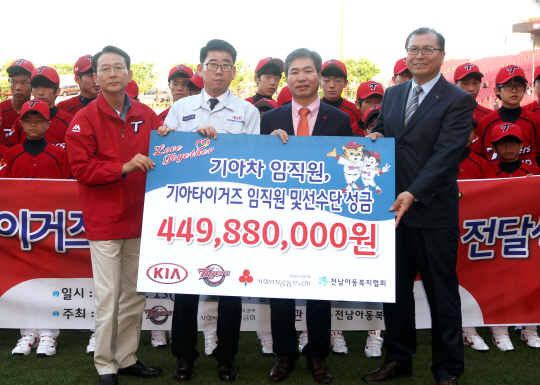 KIA 구단과 기아차는 이날 허영택 KIA 구단 단장과 엄원용 기아차 광주지원실장, 문성윤 전남아동복지협회장이 참석한 가운데 지난해 3940명이 적립한 성금 4억4988만원을 사회복지공동모금회와 전남아동복지협회에 전달했다. 또 전남아동복지협회 어린이 120명을 초청했다. 협회가 추천한 정대현군이 시구, 우수 기부자인 기아차 정윤대 기장보가 시타를 했다. 경기전에는 투수 심동섭과 한승혁이 초청 어린이들을 대상으로 사인회를 열고 만남의 시간을 가졌다.