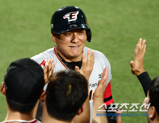 한화 이글스와 삼성 라이온즈의 2015 프로야구 경기가 14일 대구구장에서 열렸다. 5회초 2사 만루 한화 김태균이 대타로 나와 짜릿한 만루홈런을 치고 들어오며 축하를 받고 있다. 대구=정재근 기자 cjg@sportschosun.com/2015.05.14/ |