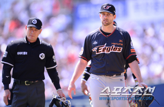10일 오후 서울 잠실야구장에서 2015 프로야구 한화와 두산의 경기가 열렸다. 3회말 무사 1루서 두산 민병헌 타석 때 한화 탈보트가 보크 판정에 글러브를 던지며 항의, 퇴장 당하고 있다. 잠실=김경민 기자 kyungmin@sportschosun.com / 2015.05.10.