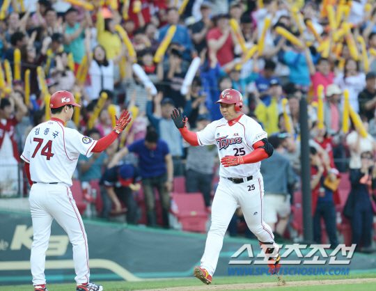두산 베어스와 KIA 타이거즈의 2015 프로야구 경기가 16일 광주구장에서 열렸다. 4회말 2사 1루 KIA 이범호가 중월 투런포를 치고 3루를 돌며 김종국 코치의 축하를 받고 있다. 광주=정재근 기자 cjg@sportschosun.com/2015.05.16/ |