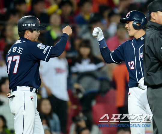 타석에는 김재호. KIA는 내외야 모두 극단적인 전진 수비 시프트를 사용했다. 1점이 곧 승부를 가른다는 코칭스태프의 판단 때문이었다. 김재호는 한승혁의 공을 통타, 외야로 보냈다. 평범한 수비 시프트였다면, 중견수 플라이가 될 가능성이 높았지만, 극단적 전진 시프트로 인해 중월 2타점 3루타가 됐다. 결국 승부에 쐐기를 박는 점수가 됐다.