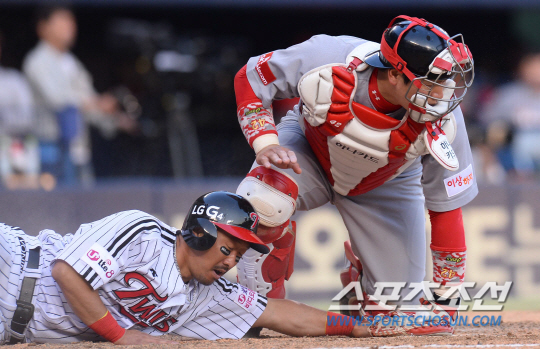 2015 KBO리그 LG트윈스와 SK와이번스의 경기가 16일 서울잠실야구장에서 열렸다. LG 5회말 2사 만루에서 한나한의 적시타때 1루주자 이병규가 홈에서 세이프 되고 있다. 잠실=최문영 기자 deer@sportschosun.com /2015.05.16/ |