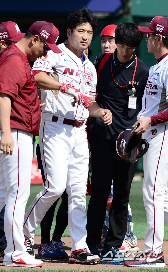 KIA 타이거즈와 넥센 히어로즈의 2015 프로야구 경기가 10일 목동구장에서 열렸다. 4회말 2사 넥센 이택근이 KIA 험버의 투구에 머리를 맞아 쓰러졌다. 한참 후에 일어선 이택근이 부축을 받으며 교체되어 나오고 있다. 목동=정재근 기자 cjg@sportschosun.com