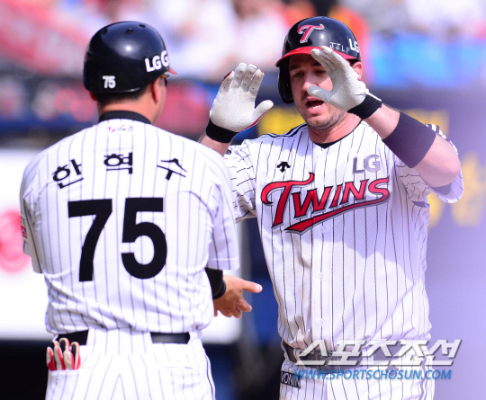 17일 오후 서울 잠실야구장에서 2015 프로야구 SK와 LG의 경기가 열렸다. 5회말 2사 2루서 LG 한나한이 우중월 2점 홈런을 친 후 한혁수 코치와 하이파이브를 나누고 있다. 잠실=김경민 기자 kyungmin@sportschosun.com / 2015.05.17.