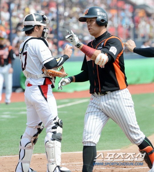 kt와 롯데의 주말 3연전 마지막 경기가 17일 수원 kt위즈파크에서 열렸다. 1회초 2사 1루 롯데 강민호가 kt 옥스프링의 투구를 받아쳐 중견수 뒤 담장을 넘어가는 2점홈런을 날렸다. 홈인하며 선행주자 황재균과 하이파이브를 하는 강민호. 수원=허상욱 기자 wook@sportschosun.com/2015.05.17/ |