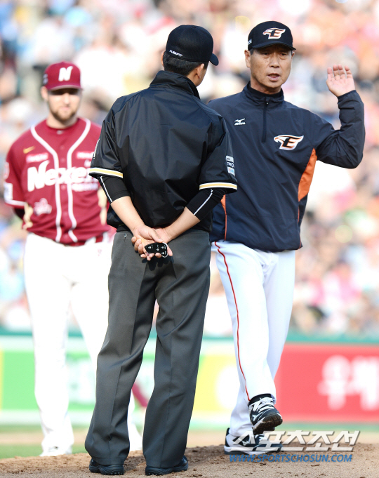 넥센 히어로즈와 한화 이글스의 2015 프로야구 경기가 17일 대전 한화생명 이글스파크에서 열렸다. 2회말 2사 1루 한화 조인성 타석. 한화 김성근 감독이 마운드에 올라 피어밴드의 1루견제 동작을 흉내내며 심판에게 항의하고 있다. 대전=정재근 기자 cjg@sportschosun.com/2015.05.17/
