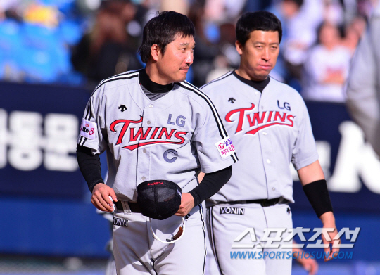 ◇지난 5일 잠실 두산전. 3대10으로 패배한 후 LG 이진영과 이병규(9번)가 아쉬운 표정을 짓고 있다. 잠실=김경민 기자 kyungmin@sportschosun.com