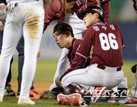 고영민의 발이 1루를 제대로 밟지 못한 상황에서 서건창이 베이스를 밟았고, 두 사람의 다리가 완전히 충돌하고 말았다. 서건창은 왼 발 뒤꿈치와 오른 무릎 통증을 호소하며 대주자 김지수로 교체됐다.
