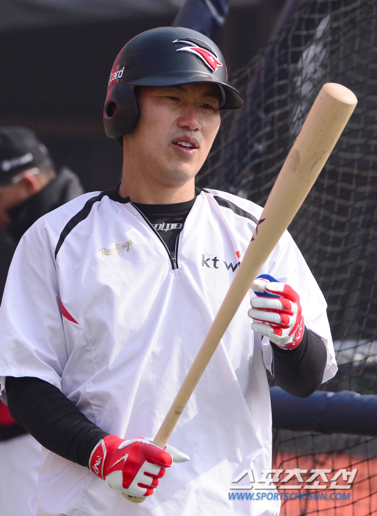 22일 수원 케이티위즈파크에서 2015 KBO리그 시범경기 KT 위즈와 KIA 타이거즈의 경기가 열렸다. 경기 전 KT 선수들이 배팅 훈련을 했다. 방망이를 바라보고 있는 장성호. 수원=송정헌 기자 songs@sportschosun.com/2015.03.22