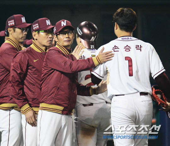LG 트윈스와 넥센 히어로즈의 2015 프로야구 경기가 19일 목동구장에서 열렸다. 넥센이 12-10의 승리를 거둔 가운데 9회 등판해 승리를 지키며 두자릿수 세이브를 따낸 손승락이 염경엽 감독의 축하를 받고 있다. 목동=정재근 기자 cjg@sportschosun.com