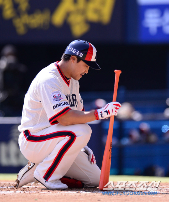 10일 오후 서울 잠실야구장에서 2015 프로야구 한화와 두산의 경기가 열렸다. 3회말 1사 1,3루서 두산 홍성흔이 삼진아웃된 후 아쉬워하고 있다. 잠실=김경민 기자 kyungmin@sportschosun.com