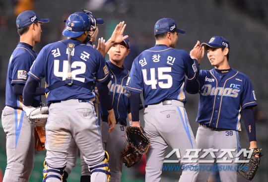 3일 수원 케이티위즈파크에서 KBO리그 kt와 NC의 경기가 열렸다. NC가 kt에 11대2로 승리하며 시리즈 스윕을 달성했다. 경기 종료 후 하이파이브를 나누고 있는 NC 선수들. 수원=송정헌 기자 songs@sportschosun.com/2015.05.03