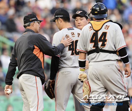 결국 송은범의 경기는 여기까지였다. 김성근 한화 감독은 투수를 송창식으로 바꿨다. 결코 바라지 않았던 상황이 벌어지고 말았다. 경기 전 머릿속에 정리해 둔 김 감독의 계산은 산산히 무너졌다. 이날 송은범의 경기 평균자책점은 무려 27.00(⅔이닝 2자책)이다. '34억투수'의 초라한 실체다.