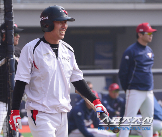 22일 수원 케이티위즈파크에서 2015 KBO리그 시범경기 KT 위즈와 KIA 타이거즈의 경기가 열렸다. 경기 전 KT 선수들이 배팅 훈련을 했다. 밝은 표정으로 훈련에 임하고 있는 장성호. 수원=송정헌 기자 songs@sportschosun.com/2015.03.22