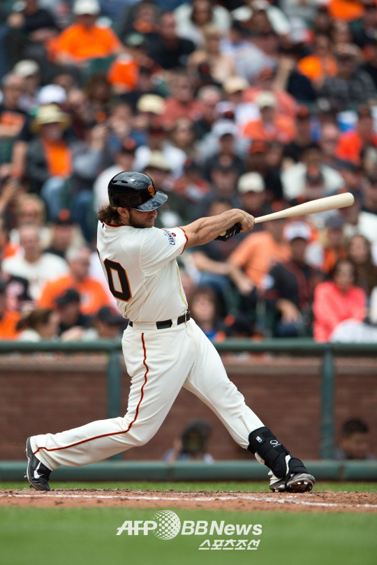 | 샌프란시스코 투수 매디슨 범가너가 22일(한국시각) LA 다저스와의 경기에서 3회말 클레이튼 커쇼로부터 홈런을 쳐내고 있다. ⓒAFPBBNews = News1 |