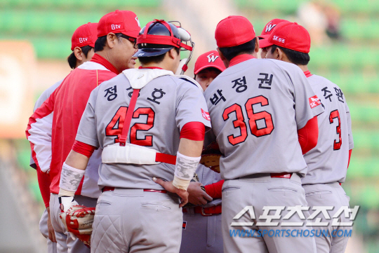 22일 오후 서울 잠실야구장에서 2015 프로야구 SK와 두산의 경기가 열렸다. 1회말 1사 만루서 KS 김용희 감독이 마운드에 올라 내야 수비수들과 이야기를 나누고 있다. 잠실=김경민 기자 kyungmin@sportschosun.com / 2015.05.22. |