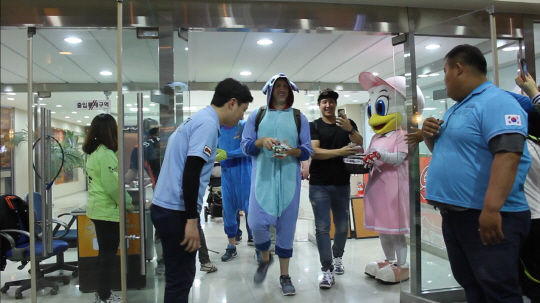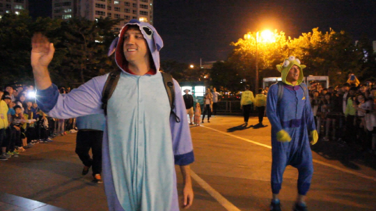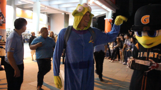 롯데 자이언츠 두 외국인 선수가 캐릭터 복장을 하고 등장했다. 에이스 우완 린드블럼과 야수 아두치다. 둘은 퇴근길에 팬들에게 사탕을 나눠주는 깜짝 이벤트를 했다. 롯데 선수들을 보기 위해 기다렸던 부산 야구팬들은 승리의 기쁨에 이어 선수들과 함께한 짧은 뒷풀이에 더욱 신이 났다.