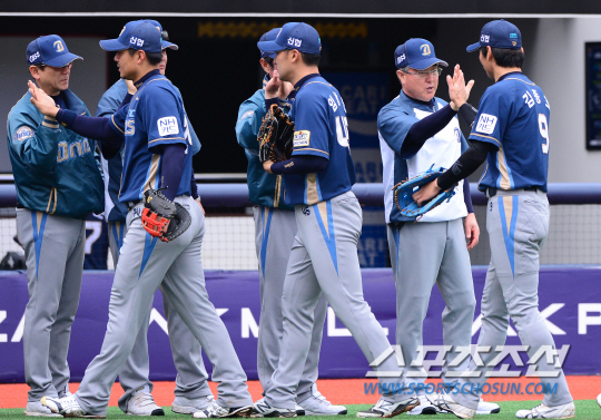 3일 수원 케이티위즈파크에서 KBO리그 kt와 NC의 경기가 열렸다. NC가 kt에 11대2로 승리하며 시리즈 스윕을 달성했다. 경기 종료 후 하이파이브를 나누고 있는 NC 선수들. 수원=송정헌 기자 songs@sportschosun.com/2015.05.03