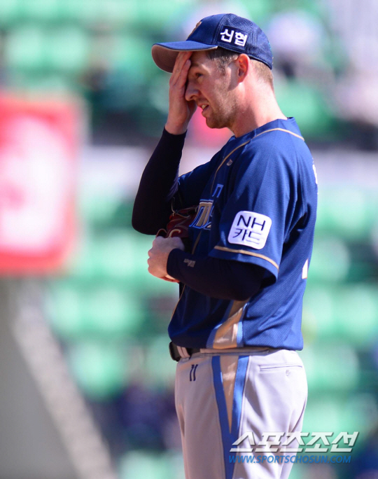 28일 오후 서울 잠실야구장에서 2015 프로야구 개막전 NC와 두산의 경기가 열렸다. NC 선발투수 찰리가 4회말 무사 만루의 위기에서 땀을 닦고 있다. 잠실=김경민 기자 kyungmin@sportschosun.com / 2015.03.28. |
