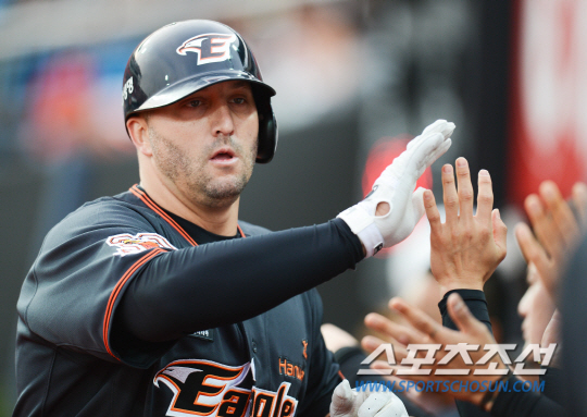 한화 이글스와 KT 위즈의 2015 프로야구 경기가 22일 수원 KT위즈파크에서 열렸다. 1회초 1사 1, 3루 한화 폭스가 1타점 외야 희생플라이를 치고 들어와 축하를 받고 있다. 수원=정재근 기자 cjg@sportschosun.com/2015.05.22/ |
