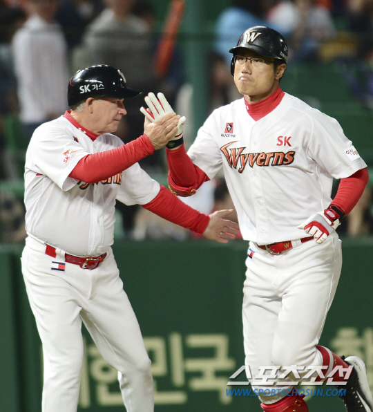 한화 이글스와 SK 와이번스의 2015 프로야구 경기가 20일 인천구장에서 열렸다. 3회말 1사 SK 박정권이 좌중월 솔로포를 치고 들어오며 알바레드 3루코치의 축하를 받고 있다. 인천=정재근 기자 cjg@sportschosun.com