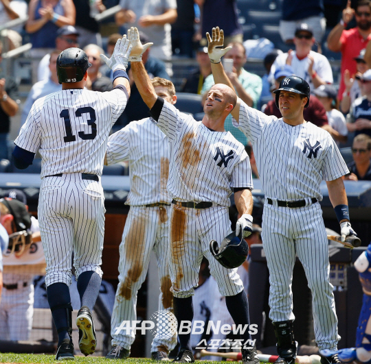 | 뉴욕 양키스 알렉스 로드리게스가 28일(한국시각) 캔자스시티 로열스와의 경기에서 3회말 3점 홈런을 터뜨린 뒤 동료들과 하이파이브를 하고 있다. ⓒAFPBBNews = News1 |