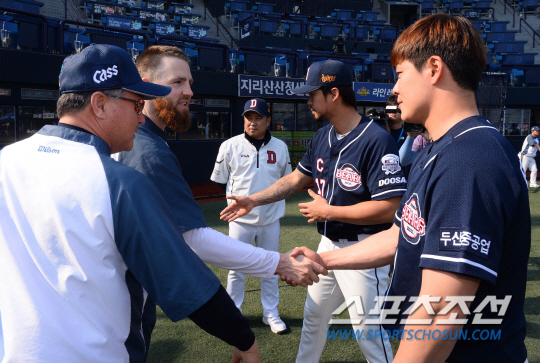2015 KBO리그 NC다이노스와 두산베어스의 28일 창원 마산야구장에서 열렸다. 경기전 두산 김태형 감독이 오재원, 민병헌과 함께 NC덕아웃을 찾아 김경문 감독과 해커, 주장 이종욱에게 전날의 사건에 대해 사과하고 있다. 27일 열린 NC-두산전에서 해커와 오재원의 신경전이 벤치 클리어링으로 번졌다. 이 과정에서 장민석이 퇴장 당했다. 마산=최문영 기자 deer@sportschosun.com