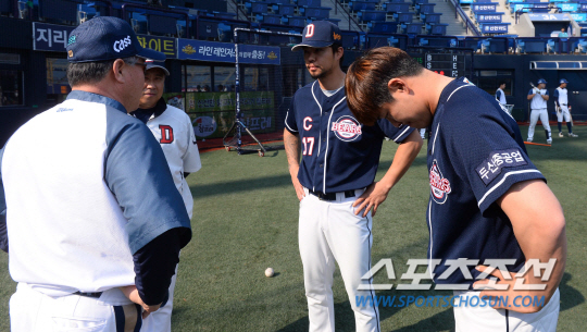 김 감독 역시 덕아웃에서 나와 그라운드에서 두산 측을 맞았다. 김태형 감독과 오재원 민병헌은 모자를 벗고 정중히 사과의 표시를 했다.