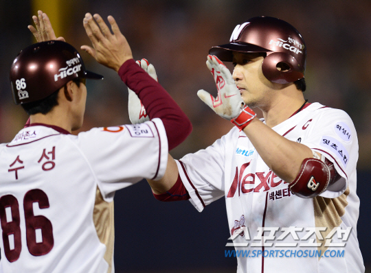 LG 트윈스와 넥센 히어로즈의 2015 프로야구 경기가 21일 목동구장에서 열렸다. 5회말 1사 3루 넥센 이택근이 역전 1타점 안타를 치고 1루로 달려나가 정수성 코치의 축하를 받고 있다. 목동=정재근 기자 cjg@sportschosun.com