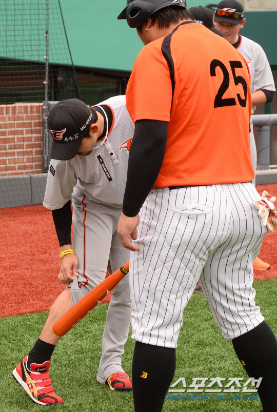 2015 KBO리그 롯데자이언츠와 한화이글스의 경기가 30일 울산 문수야구장에서 열렸다. 경기전 한화 이용규가 롯데 최준석에게 공에 맞은 부위를 보여주며 아픔을 호소하고 있다. 이용규는 전날 6회초 선두타자로 나와 린드블럼의 투구에 종아리를 강타당했다. 울산=최문영 기자 deer@sportschosun.com