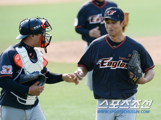 한화 이글스와 삼성 라이온스의 프로야구 시범경기가 22일 대구구장에서 열렸다. 8회말 2사 2, 3루 한화 윤규진이 삼성 이승엽을 삼진으로 잡으며 위기를 넘긴 후 지성준 포수와 손을 맞대고 있다. 대구=정재근 기자 cjg@sportschosun.com/2015.03.22/