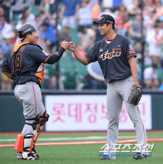 2015 KBO리그 롯데자이언츠와 한화이글스의 경기가 30일 울산 문수야구장에서 열렸다. 한화 마무리 윤규진이 롯데를 상대로 4대3 승리를 확정지은후 포수 허도환과 하이파이브 하고 있다. 울산=최문영 기자 deer@sportschosun.com /2015.05.30/ |