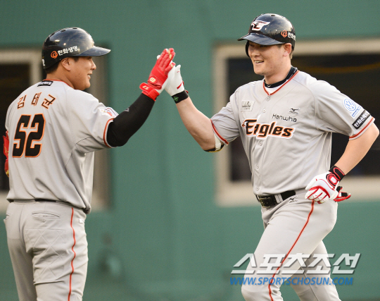 한화 이글스와 넥센 히어로즈의 2015 프로야구 경기가 2일 목동구장에서 열렸다. 3회초 무사 한화 이성열이 넥센 한현희를 상대로 중월 솔로포를 치고 들어오며 김태균의 축하를 받고 있다. 한화는 시즌 성적 3승 2패, 방어율 7.57의 배영수가 선발로 나섰다. 넥센은 6승 2패, 방어율 5.55의 한현희가 선발 등판했다. 목동=정재근 기자 cjg@sportschosun.com