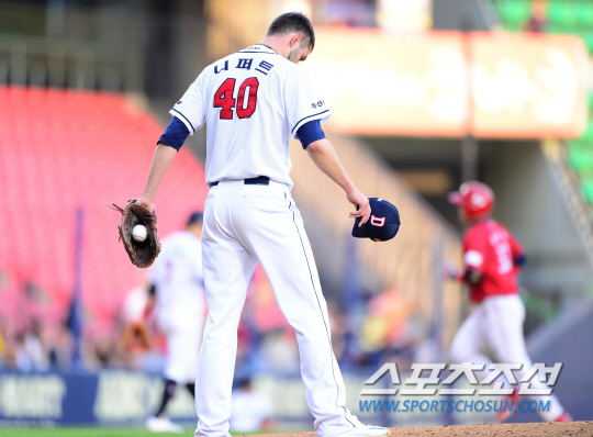 6월 2일 잠실구장에서 KBO리그 두산과 KIA의 경기가 열렸다. KIA 서재응과 두산 니퍼트가 선발 맞대결을 펼쳤다. 두산 니퍼트가 2회 KIA 이성우에게 홈런을 허용했다. 이성우가 그라운드를 돌고 있는 사이 아쉬워하고 있는 니퍼트. 잠실=송정헌 기자 songs@sportschosun.com/2015.06.02