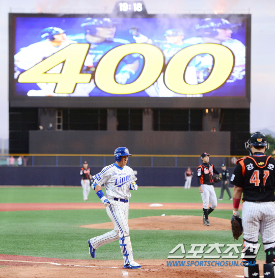삼성 라이온즈 이승엽(39)이 국내 프로야구 최초로 통산 400홈런 대기록을 달성했다. 이승엽은 3일 포항 롯데전 3회 2사서 상대선발 구승민을 상대로 좌중월 1점포를 쏘아올렸다. 1995년 프로입단한 이승엽은 KBO리그 13시즌만에 통산 400홈런을 쏘아올렸다. 한 시즌 평균 30.8홈런을 날린 셈이다. 이승엽은 이번 2015시즌 10호 홈런을 치면서 6번째로 11년 연속 두자릿수 홈런 기록도 달성했다.