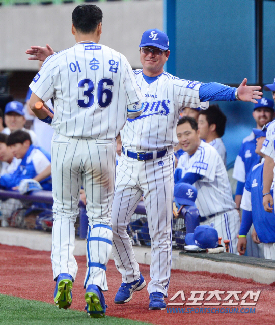 3일 오후 포항야구장에서 2015 프로야구 롯데와 삼성의 경기가 열렸다. 3회말 2사서 삼성 이승엽이 통산 400홈런을 친 후 류중일 감독과 포옹을 나누고 있다. 포항=김경민 기자 kyungmin@sportschosun.com / 2015.06.03.