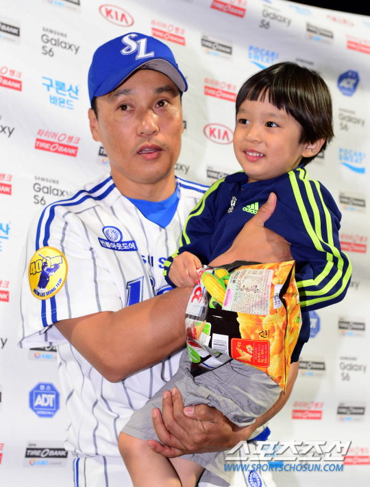 3일 오후 포항야구장에서 2015 프로야구 롯데와 삼성의 경기가 열렸다. 이승엽이 인터뷰에서 아들 은엽군을 안고 기뻐하고 있다. 포항=김경민 기자 kyungmin@sportschosun.com