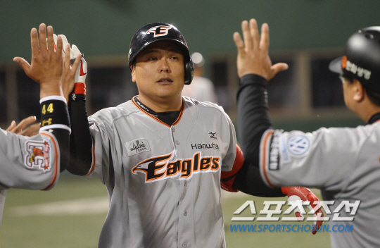 2015 KBO리그 롯데자이언츠와 한화이글스의 경기가 3일 서울 목동야구장에서 열렸다. 한화 7회초 2사 1,2루에서 김태균이 중월 3점 홈런을 치고 동료들의 축하를 받고있다. 목동=최문영 기자 deer@sportschosun.com /2015.06,03/