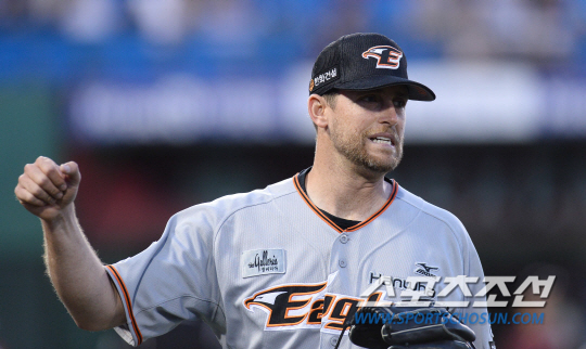 2015 KBO리그 롯데자이언츠와 한화이글스의 경기가 3일 서울 목동야구장에서 열렸다. 한화 선발투수 탈보트가 넥센 3회말 1사 1루에서 윤석민을 투수앞 병살타 처리한후 포효하고 있다. 목동=최문영 기자 deer@sportschosun.com /2015.06,03/