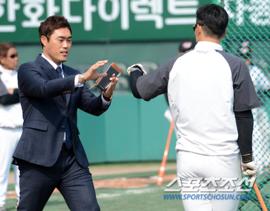 15일 대전 한화생명 이글스파크에서 2015 KBO 리그 한화와 삼성의 주중 3연전 두번째 경기가 예정된 가운데 한화 선수단이 훈련을 펼쳤다. 조성환 해설위원이 김재현 코치와 인사를 나누고 있다. 대전=허상욱 기자 wook@sportschosun.com/2015.04.15/